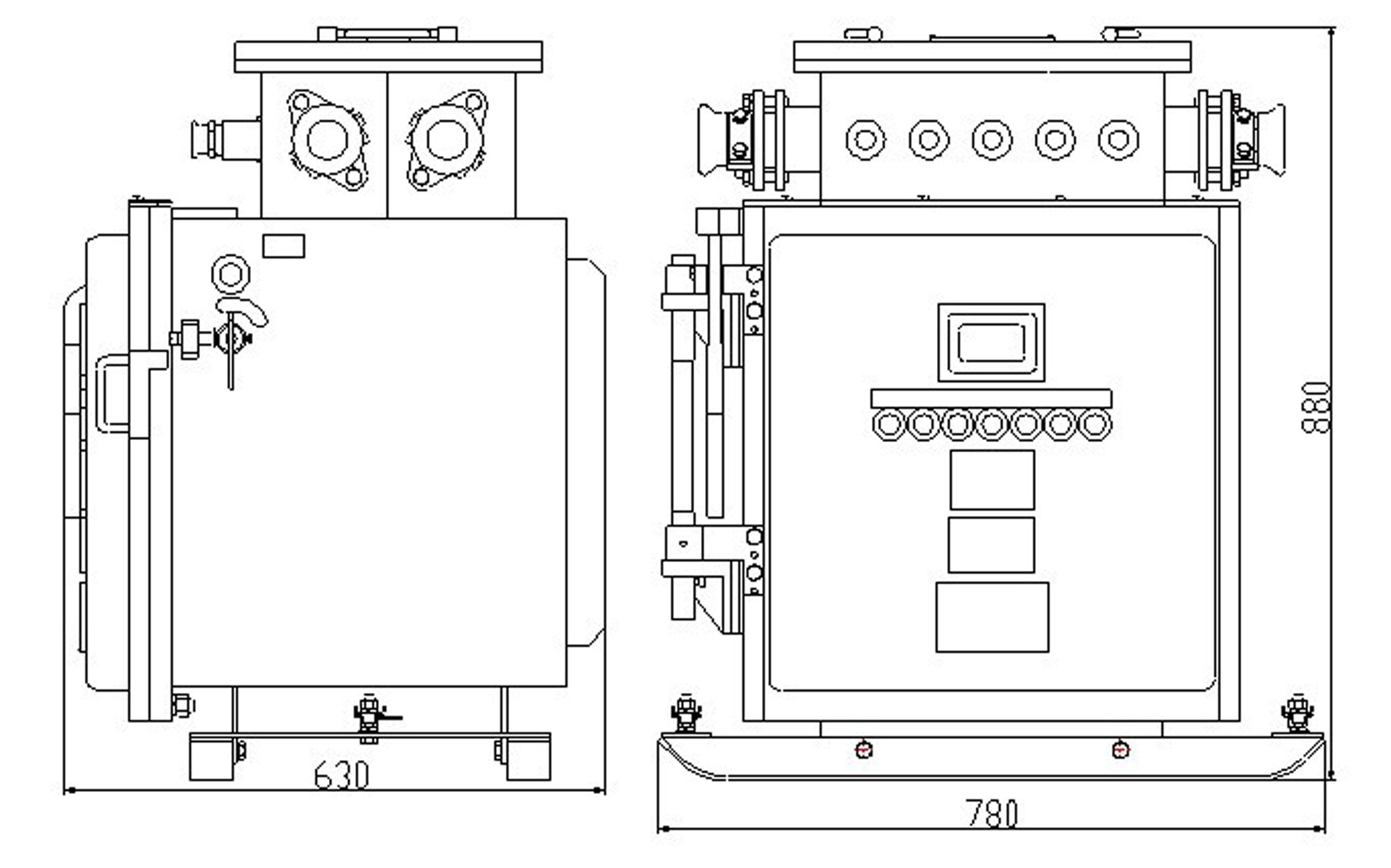 綜合裝置由隔爆外殼、主變壓器和控制部分等組成。隔爆外殼為方形,殼蓋與殼身采用滑動止口結構,開啟方便。外殼上部的接線箱作為引進和引出電纜用,外殼右側裝有操作組合開關的手柄,并有可靠的機械聯鎖裝置,門蓋上裝有控制按鈕和試驗按鈕,門蓋上有一觀察窗,可以從外面觀察到裝置里面液晶漢顯顯示屏的指示狀態。殼體內的控制部分由控制器件板和真空交流接觸器板組成。在控制器件板上裝有微電腦控制器、液晶顯示屏、電流取樣板、電流傳感器、濾波器、電源控制變壓器、試驗電阻、保險等器件。真空交流接觸器板上裝有真空交流接觸器、管式熔斷器,電流互感器,三相電抗器等器件。控制器件板與真空交流接觸器板通過一組航空插件及連線構成聯系。防爆外殼箱體內裝有主變壓器。